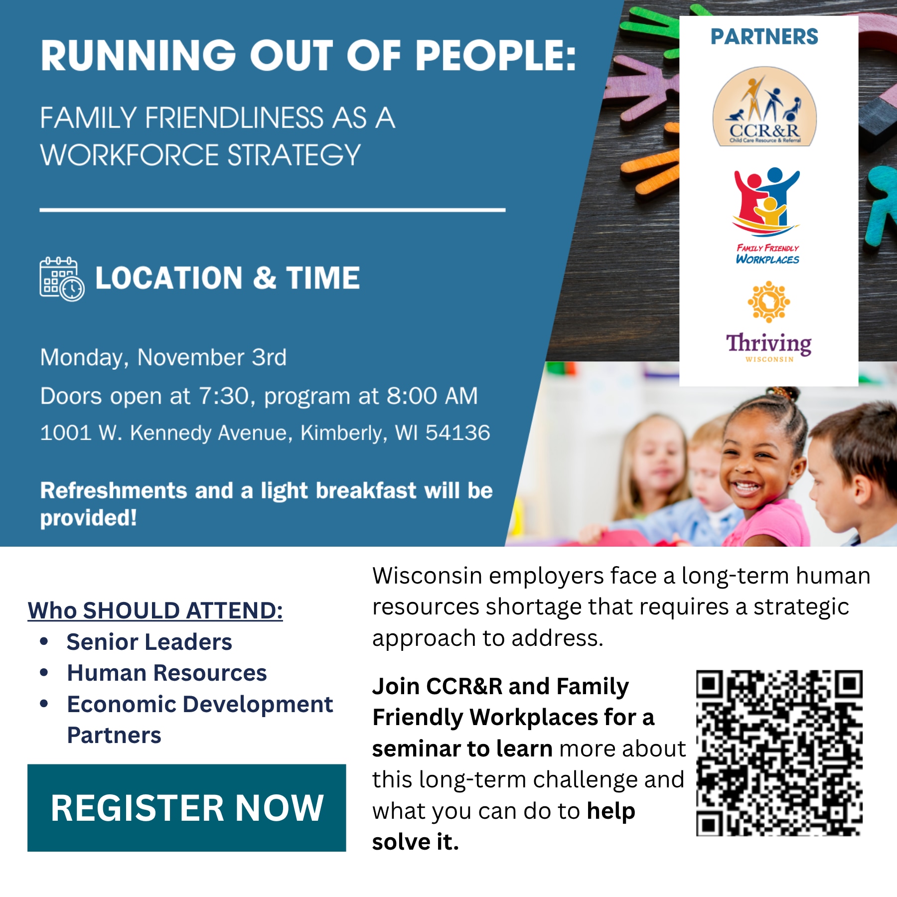 Attendees will gain valuable insights from CCR&R and featured speaker Neil Kline, Executive Director of Family Friendly Workplaces. Kline will present on the long-term human resources shortage affecting Wisconsin businesses and share innovative, family-friendly strategies designed to enhance workforce sustainability and organizational resilience.