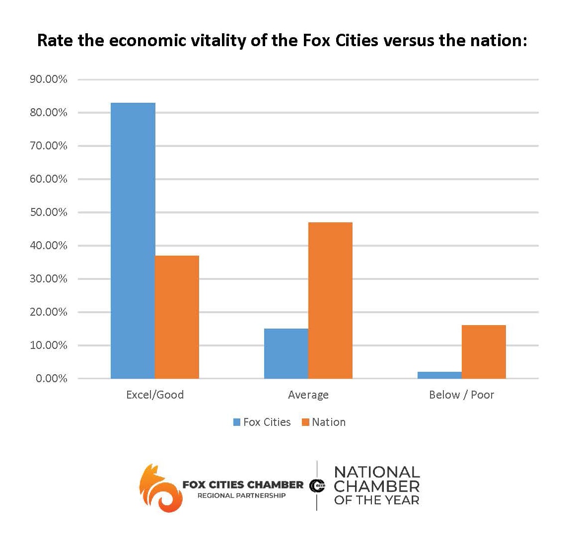 Business leaders continue to express strong confidence in the region. Nearly 88% rate the Fox Cities as an “excellent” or “good” place to do business, and more than 83% rate the region’s economic vitality as excellent or good
