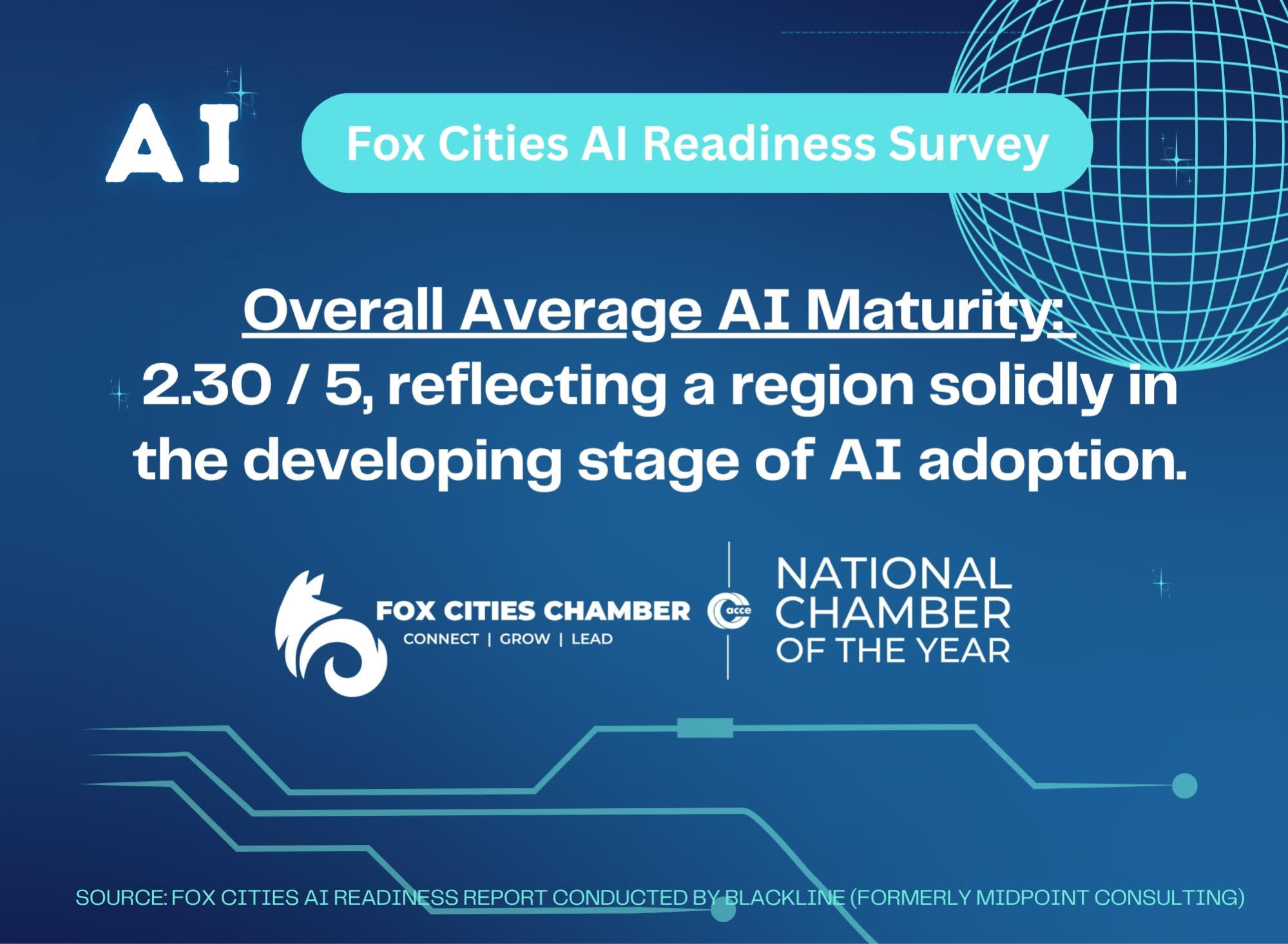 The survey, conducted in partnership with Blackline, combines 45 organizational assessments and survey responses collected at the Fox Cities Chamber’s AI Business Summit on November 5, 2025. The assessment evaluated readiness across six domains: strategy, data, governance, architecture, people, and operations. The region’s overall AI maturity score is 2.30 out of 5, placing the Fox Cities firmly in the “developing” stage of adoption; an expected and encouraging benchmark for a mid-sized region early on its AI journey.