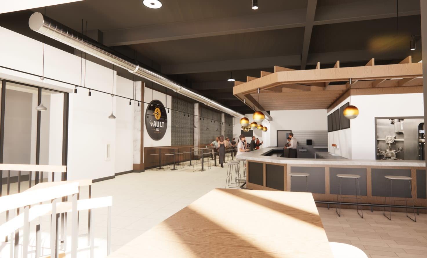 Hoffman’s design of the 9,000+ square foot space began in September 2024. Vault 202 will feature a main bar with a gas-fired pizza oven and ample seating, along with a private event space with views of the brewery equipment. A spiral staircase will lead downstairs to a future bar and lounge with seating inside an existing bank vault.